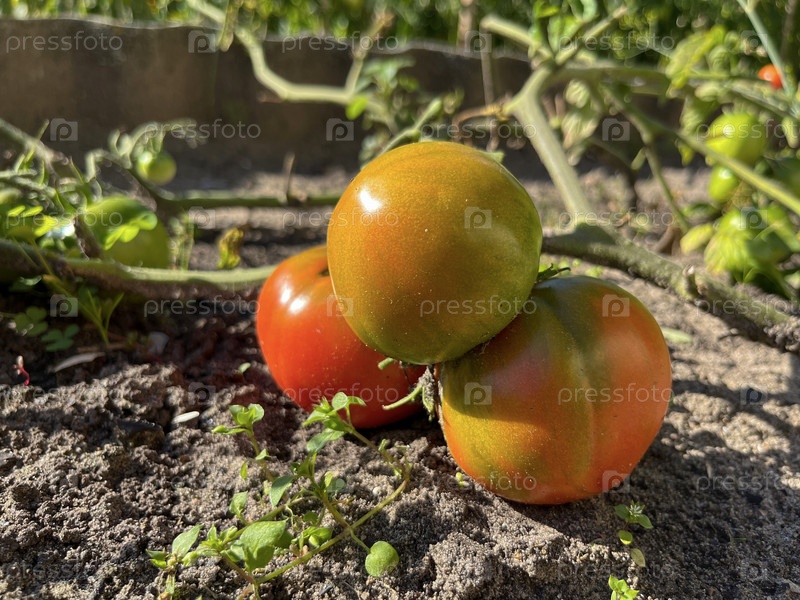 Помидоры растут и созревают в саду на грядке