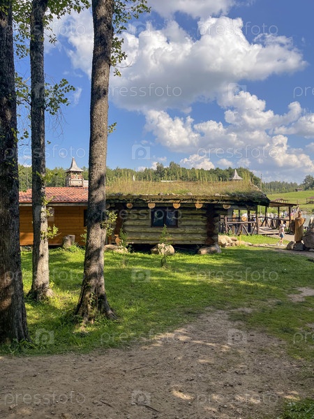 Музей под открытым небом представляет собой деревенскую хижину с зеленой травой, растущей на крыше