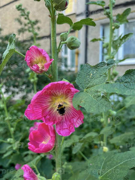 Шмель опыляет розовый цветок мальвы