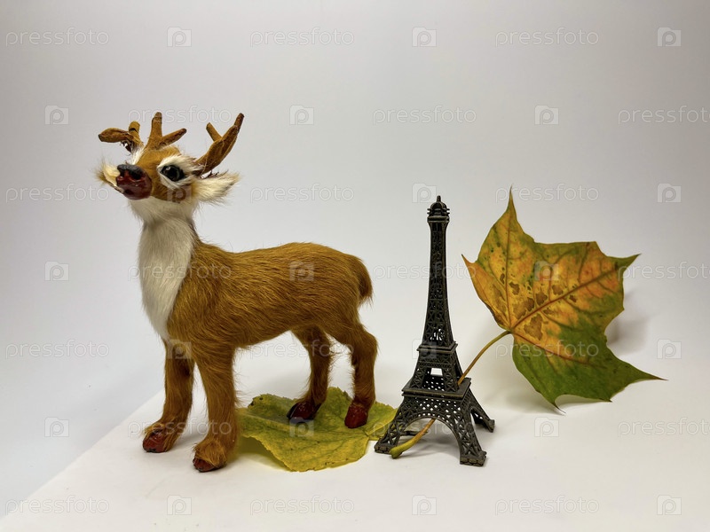 Игрушечный олень и Эйфелева башня с разноцветными осенними листьями