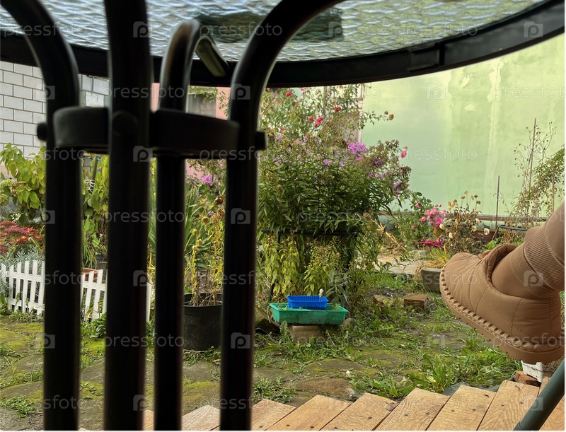 Стеклянный стол на даче и нога дачника на отдыхе за столом