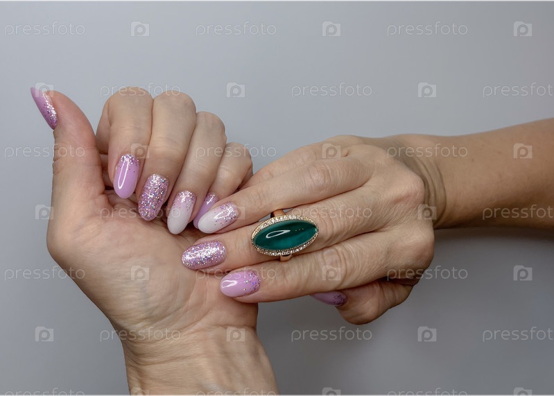 Женские руки с ногтями, покрытыми розовым блестящим лаком