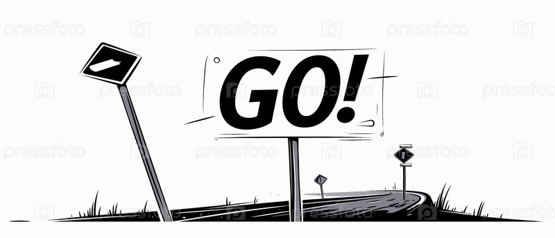 Мультипликационный знак 'Go' на дороге. белый фон