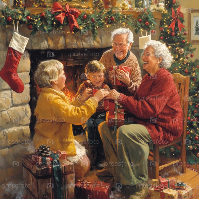 Семья обменивается подарками у камина в канун Рождества