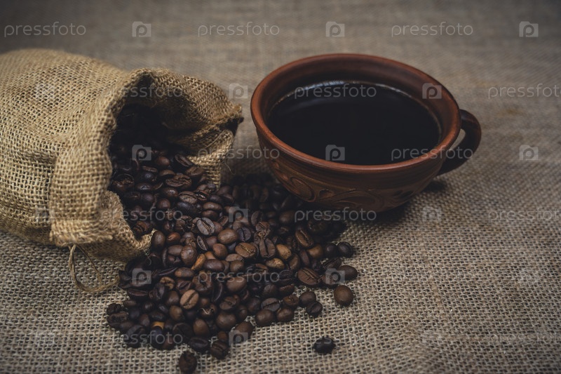 Коричневая керамическая чашка черного кофе с мешковиной, из которой высыпались кофейные зерна