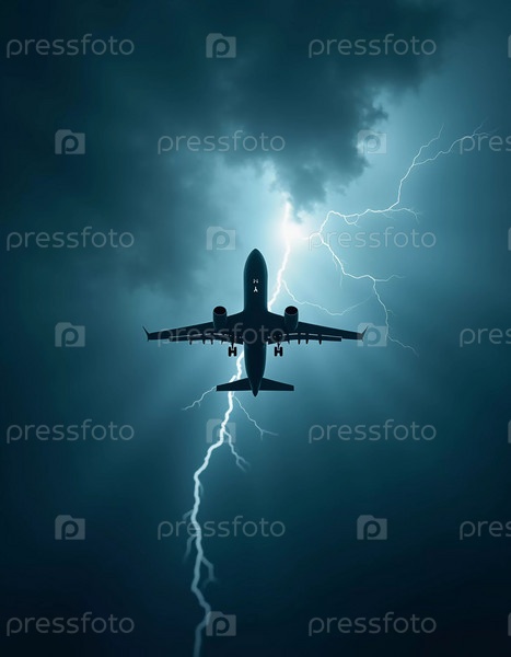 Самолет попадает в сильную грозу, окруженный темными облаками и освещенный яркими ударами молний, подчеркивающими опасность в небе. Причины авиакатастроф. Генеративный ИИ