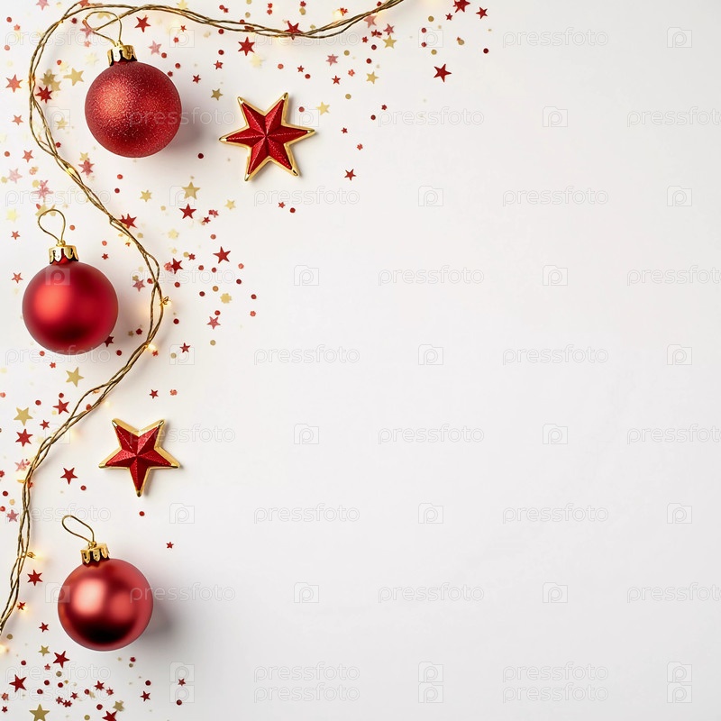 Яркие красные и золотые рождественские украшения украшают белый фон, сопровождаемые мерцающими звездами и нитями нежных огней, создавая праздничную атмосферу. Генеративный ИИ