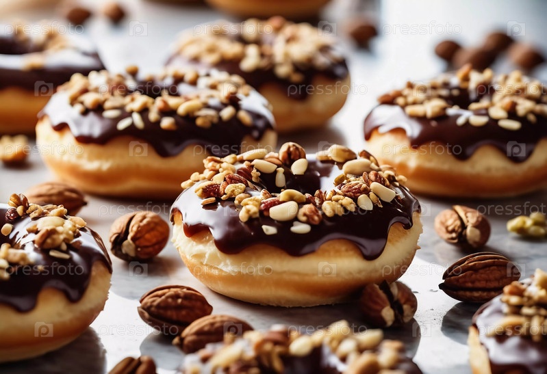 Соблазнительная витрина из пончиков, покрытых шоколадной глазурью и украшенных разнообразными орехами, выставлена на деревенском деревянном столе. Теплое освещение подчеркивает вкусные детали и текстуры угощений. Генеративный ИИ