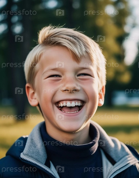 Веселый молодой кавказский мальчик со светлыми прямыми взъерошенными волосами. Маленький милый красивый финский ребенок улыбается. Положительные эмоции. День на свежем воздухе. Счастливое детство. Генеративный ИИ. Скандинавский тип лица