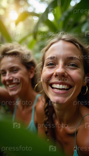 Друзья празднуют летние каникулы в пышной тропической обстановке с смехом и улыбками среди яркой зелени.Тропы это климатические зоны Земли, в которых Солнце находится в зените по крайней мере один раз в год