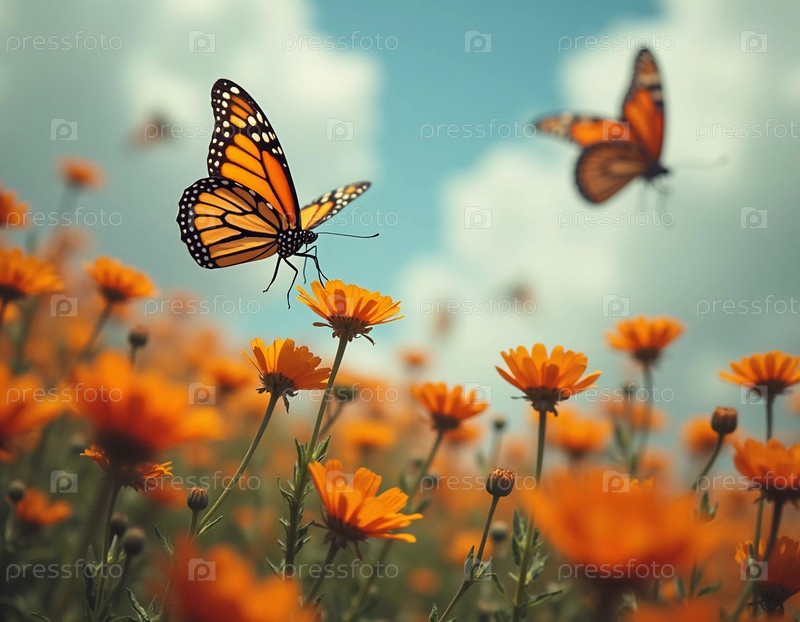 Нежная бабочка-монарх грациозно порхает над ярко-оранжевыми цветами, окруженная мягким размытым фоном, который вызывает ощущение безмятежной атмосферы сада. Генеративный ИИ