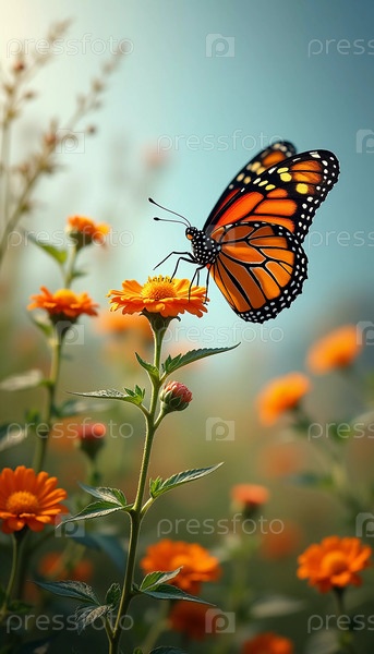 Нежная бабочка-монарх грациозно порхает над ярко-оранжевыми цветами, окруженная мягким размытым фоном, который вызывает ощущение безмятежной атмосферы сада. Генеративный ИИ