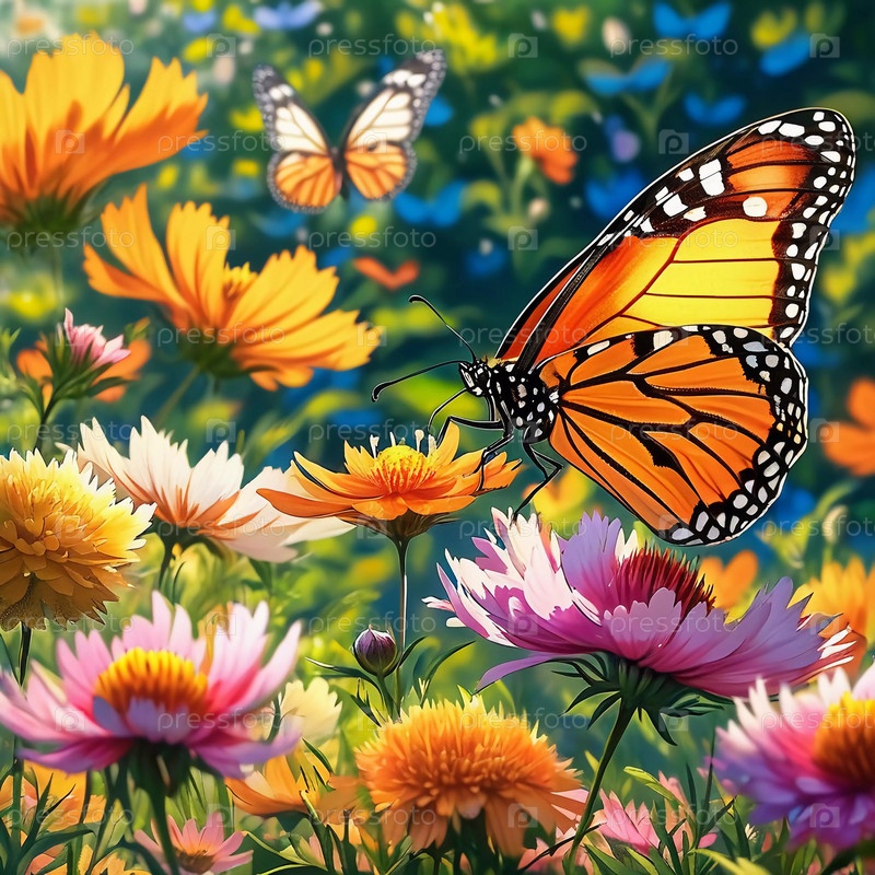 Группа ярких бабочек грациозно танцует вокруг цветущих цветов в красочном саду. Яркие цветы создают живую атмосферу под теплым солнечным светом. Генеративный ИИ
