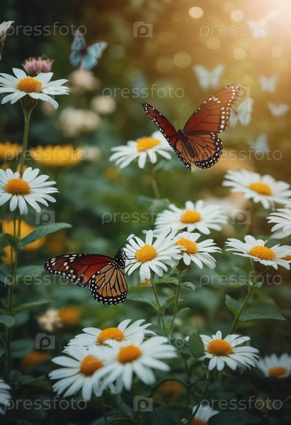Группа ярких бабочек грациозно танцует вокруг цветущих цветов в красочном саду. Яркие цветы создают живую атмосферу под теплым солнечным светом. Генеративный ИИ