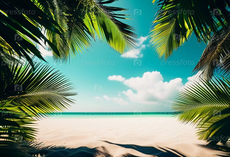 Тихий пляж, окруженный пышными пальмовыми листьями, открывает мягкий белый песок, ведущий к прозрачным голубым водам, освещенным солнечным небом, украшенным пушистыми облаками. Генеративный ИИ
