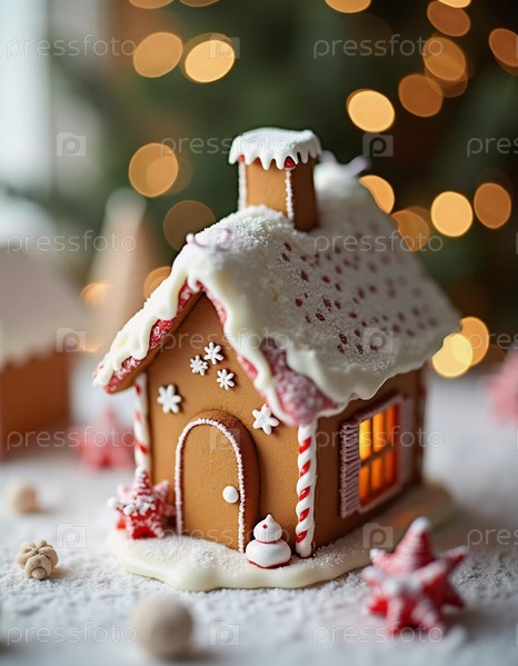 Очаровательный пряничный домик с заснеженной крышей стоит на тарелке, окруженный праздничными украшениями, передавая дух праздника. Белый сладкий сливочный крем. Новый год, рождественские украшения. Генеративный ИИ