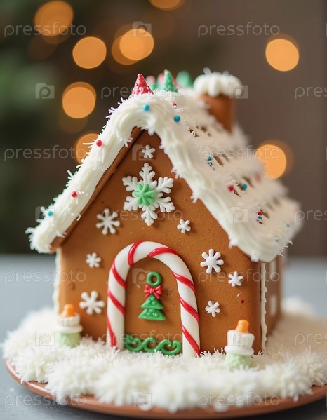 Очаровательный пряничный домик с заснеженной крышей стоит на тарелке, окруженный праздничными украшениями, передавая дух праздника. Белый сладкий сливочный крем. Новый год, рождественские украшения. Генеративный ИИ
