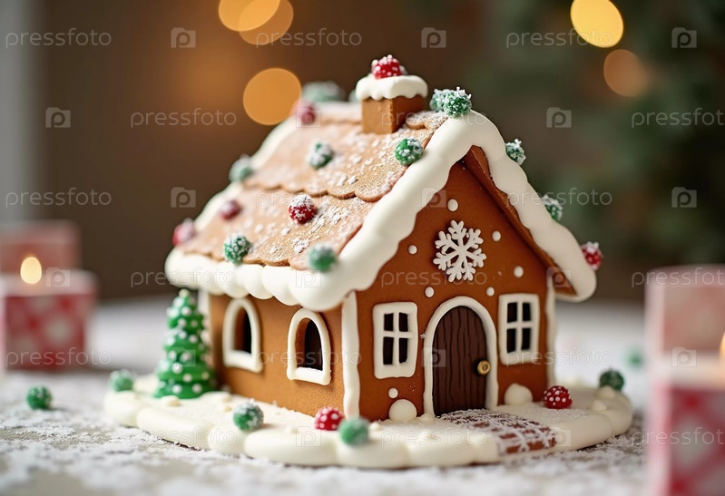 Очаровательный пряничный домик с заснеженной крышей стоит на тарелке, окруженный праздничными украшениями, передавая дух праздника. Белый сладкий сливочный крем. Новый год, рождественские украшения. Генеративный ИИ