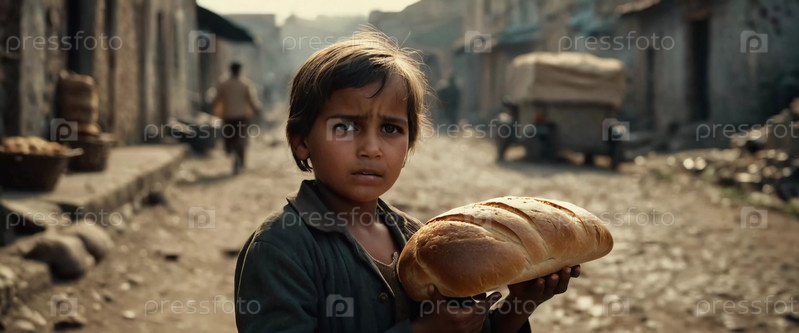 Маленький ребенок стоит в мрачном переулке, держа буханку хлеба. На заднем плане видны обветшалые дома и другие дети, подчеркивающие суровые условия жизни в трущобах. Генеративный ИИ