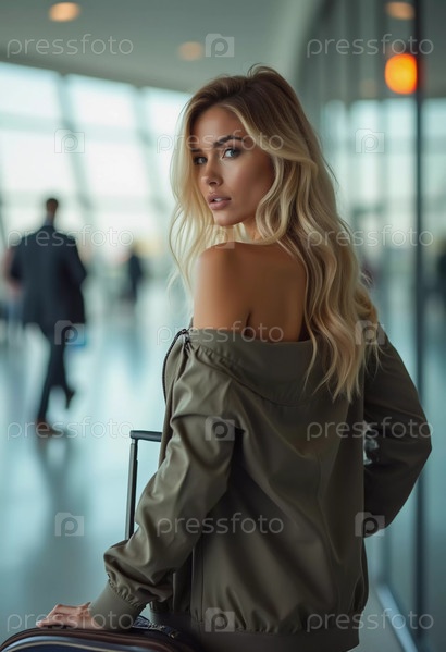 Стильная блондинка стоит в аэропорту, держа чемодан и оглядываясь назад с уверенным выражением лица. Путешественники суетятся вокруг нее, пока она ждет, одетая в повседневную облегающую одежду. Генеративный ИИ