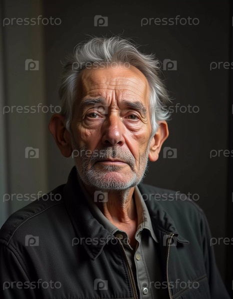 Пожилой мужчина стоит уверенно, одетый в черную куртку. Мягко освещенный фон. Портрет русского мужчины, 60-70-80 лет. Серьезное, мудрое, вдумчивое лицо. Пенсионер с седыми волосами. Генеративный ИИ