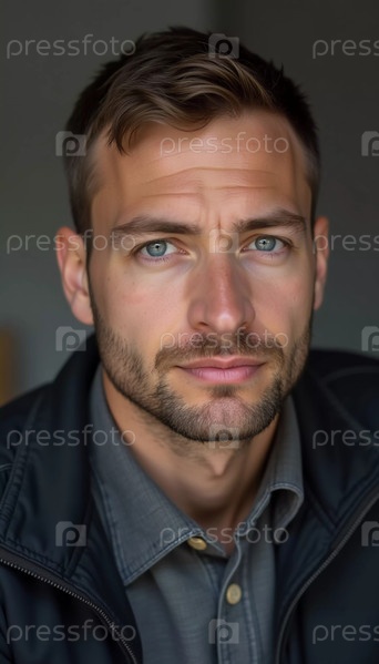 Молодой человек из России смотрит прямо на зрителя яркими голубыми глазами. Взъерошенные волосы и расслабленное выражение лица. Самоанализ и спокойствие. Портрет красивого мужчины 30 лет. Генеративный ИИ