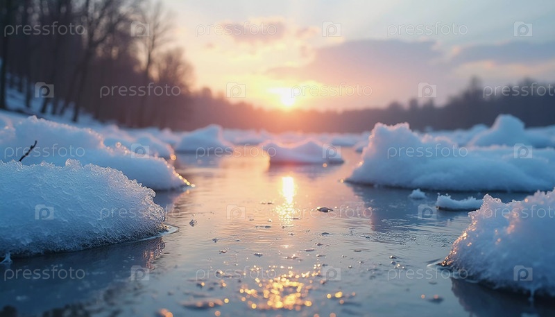 Солнечный свет пробивается сквозь деревья на рассвете, отражаясь от спокойной реки, усеянной тающим льдом. Сосульки висят рядом, создавая мирную и теплую весеннюю атмосферу. Генеративный ИИ