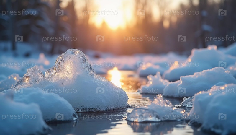 Солнечный свет пробивается сквозь деревья на рассвете, отражаясь от спокойной реки, усеянной тающим льдом. Сосульки висят рядом, создавая мирную и теплую весеннюю атмосферу. Генеративный ИИ