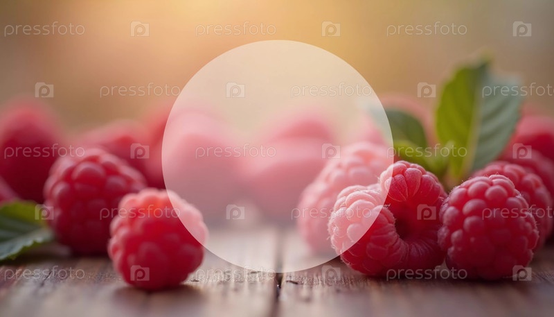 Зрелые ягоды малины представлены на округлом полупрозрачном фоне и с мягким эффектом боке, создающим мечтательную атмосферу.Упаковка для чая, джема или косметики с ароматом малины
