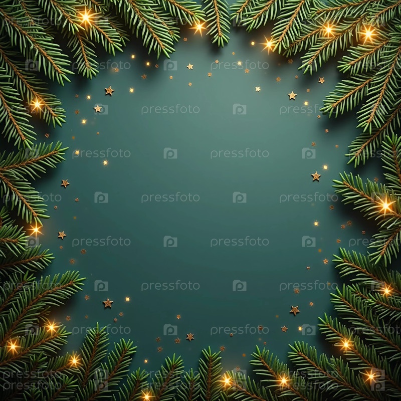Еловые ветки обрамляют спокойный зеленый фон, украшенный золотыми украшениями и звездами, создавая теплую, уютную атмосферу, идеально подходящую для праздничных торжеств и праздников. Генеративный ИИ