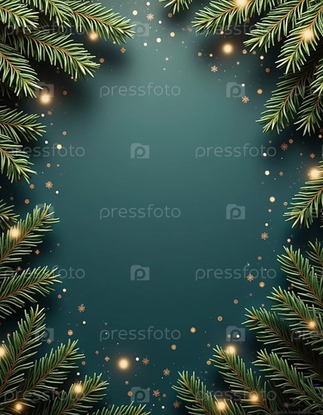 Еловые ветки обрамляют спокойный зеленый фон, украшенный золотыми украшениями и звездами, создавая теплую, уютную атмосферу, идеально подходящую для праздничных торжеств и праздников. Генеративный ИИ