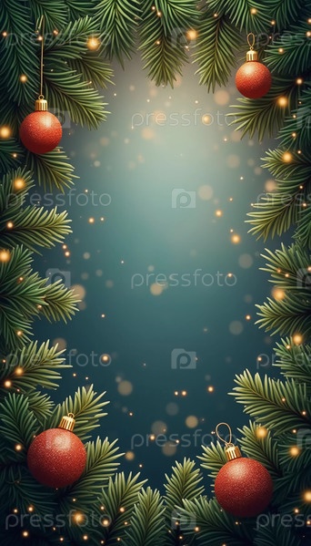 Еловые ветки обрамляют спокойный зеленый фон, украшенный золотыми украшениями и звездами, создавая теплую, уютную атмосферу, идеально подходящую для праздничных торжеств и праздников. Генеративный ИИ