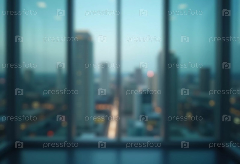 Размытая перспектива демонстрирует современный городской горизонт через стеклянную стену в сумерках, раскрывая яркость и сложность городской жизни. Угасающий свет отражает городскую энергию. Генеративный ИИ