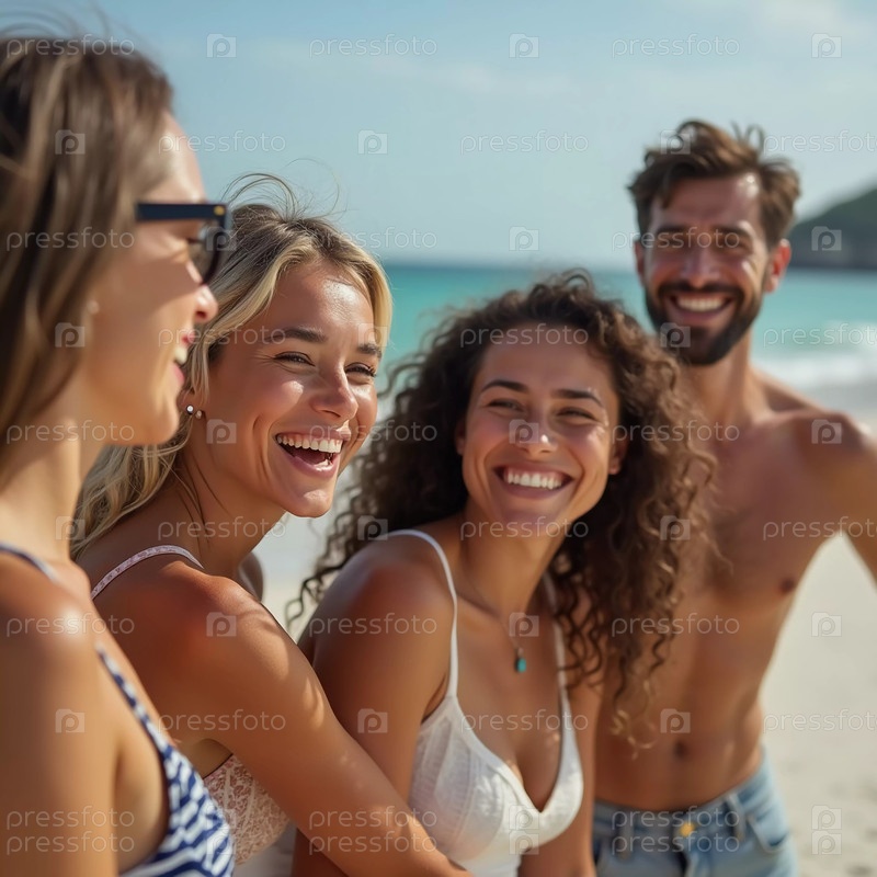 Друзья наслаждаются солнечным днем на пляже, улыбаются и смеются, запечатлевая веселый момент вместе. Голубое небо дополняет их радостный дух и летнюю атмосферу. Белый песок. Генеративный ИИ