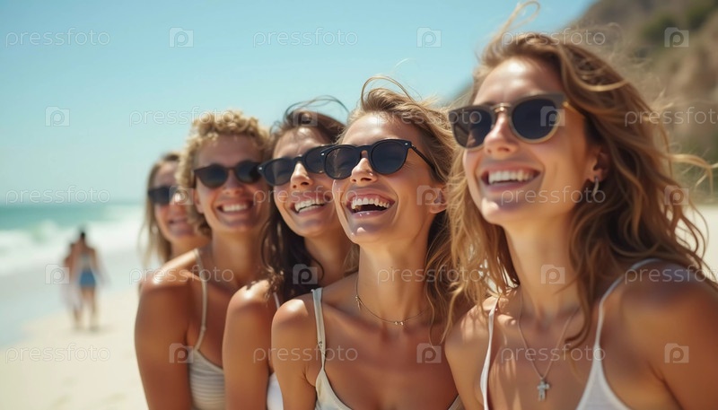 Друзья наслаждаются солнечным днем на пляже, улыбаются и смеются, запечатлевая веселый момент вместе. Голубое небо дополняет их радостный дух и летнюю атмосферу. Белый песок. Генеративный ИИ