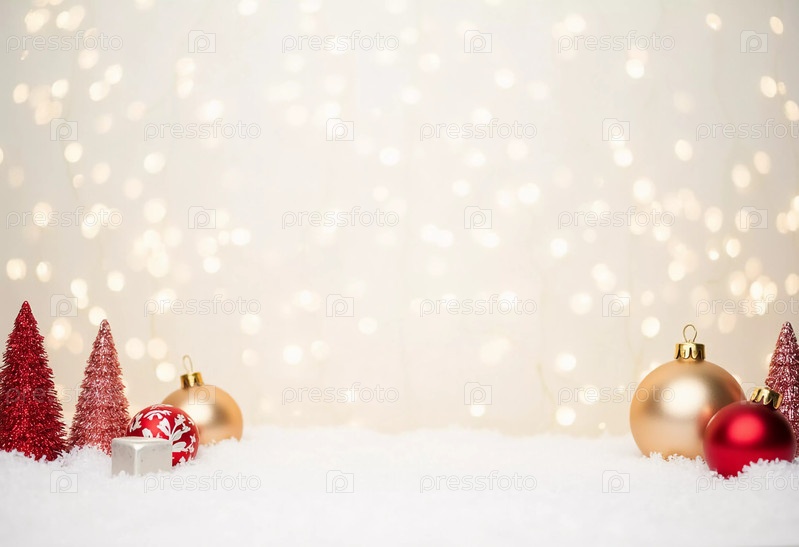 Праздничные украшения включают красные и золотые украшения, маленькие деревья и подарочную коробку, все это на мягком белом фоне, освещенном сверкающими огнями. Генеративный ИИ