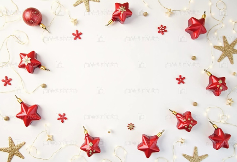 Ярко-красные украшения в форме звезд окружены золотыми звездами и конфетти, создавая веселую и уютную атмосферу для рождественских и новогодних праздников. Генеративный ИИ