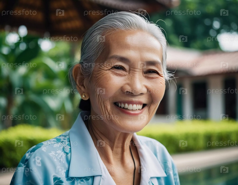 Радостная женщина, около 70 лет, тепло улыбается, стоя в прекрасном саду в Таиланде. Ее сияющее выражение подчеркивает безмятежную атмосферу вокруг нее
