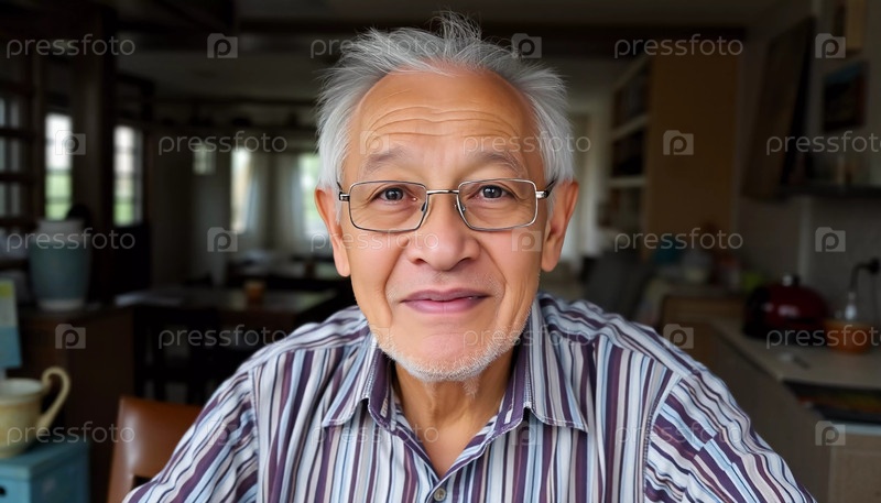 Пожилой таец удобно сидит в помещении с теплой улыбкой, окруженный домашней атмосферой. Его полосатая рубашка добавляет очарования интимной обстановке, подчеркивая радость повседневной жизни
