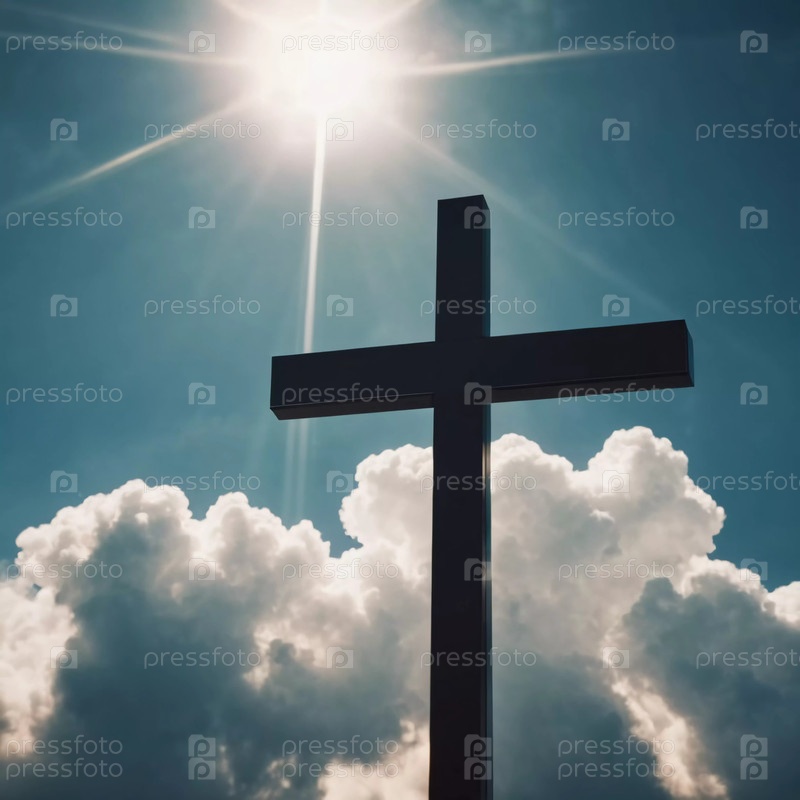 Крест возвышается на видном месте, когда солнечный свет пронзает густые облака, создавая сияющее зрелище в небе в начале полудня. Генеративный ИИ