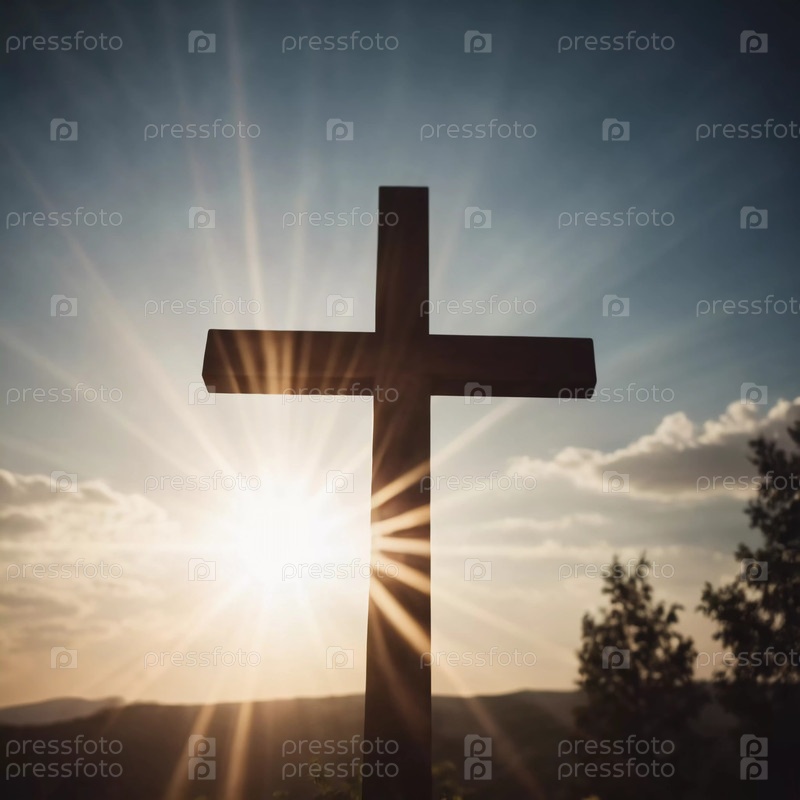 Крест возвышается на видном месте, когда солнечный свет пронзает густые облака, создавая сияющее зрелище в небе в начале полудня. Генеративный ИИ
