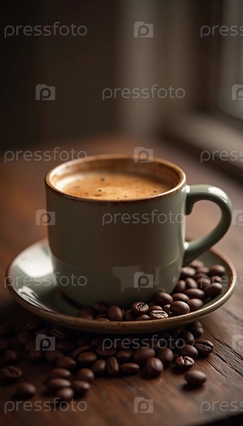 Чашка эспрессо стоит на деревенском деревянном столе, окруженном кофейными зернами, создавая теплую и уютную обстановку, идеально подходящую для наслаждения тихим моментом. Генеративный ИИ
