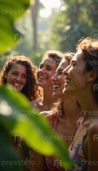 Друзья празднуют летние каникулы в пышной тропической обстановке с смехом и улыбками среди яркой зелени.Тропы это климатические зоны Земли, в которых Солнце находится в зените по крайней мере один раз в год