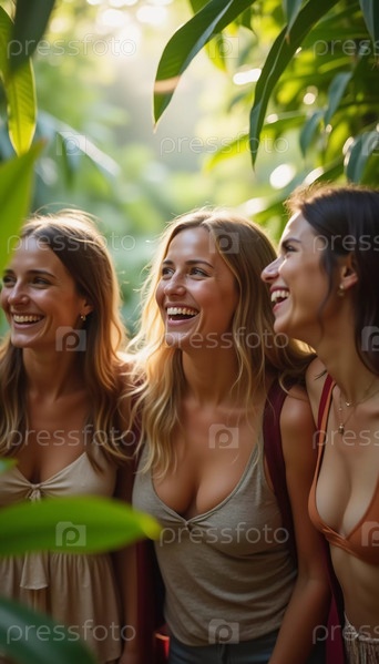 Друзья празднуют летние каникулы в пышной тропической обстановке с смехом и улыбками среди яркой зелени.Тропы это климатические зоны Земли, в которых Солнце находится в зените по крайней мере один раз в год