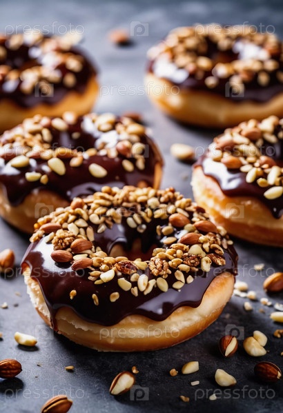 Соблазнительная витрина из пончиков, покрытых шоколадной глазурью и украшенных разнообразными орехами, выставлена на деревенском деревянном столе. Теплое освещение подчеркивает вкусные детали и текстуры угощений. Генеративный ИИ