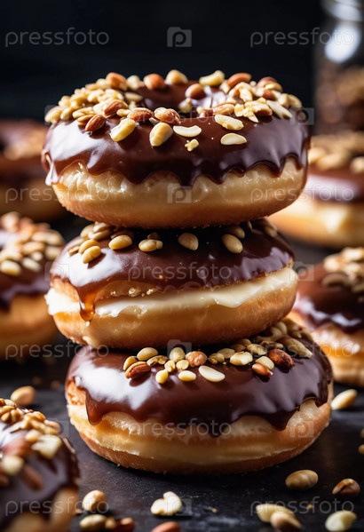 Соблазнительная витрина из пончиков, покрытых шоколадной глазурью и украшенных разнообразными орехами, выставлена на деревенском деревянном столе. Теплое освещение подчеркивает вкусные детали и текстуры угощений. Генеративный ИИ