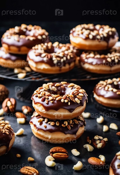 Соблазнительная витрина из пончиков, покрытых шоколадной глазурью и украшенных разнообразными орехами, выставлена на деревенском деревянном столе. Теплое освещение подчеркивает вкусные детали и текстуры угощений. Генеративный ИИ