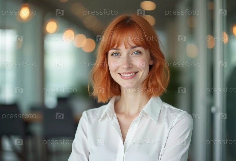 Уверенная в себе офисная женщина с рыжими волосами тепло улыбается, одетая в белую рубашку. На заднем плане можно увидеть яркое современное рабочее пространство, что указывает на профессиональную среду. Генеративный ИИ