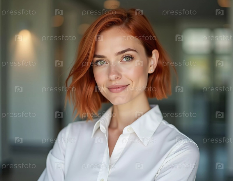 Уверенная в себе офисная женщина с рыжими волосами тепло улыбается, одетая в белую рубашку. На заднем плане можно увидеть яркое современное рабочее пространство, что указывает на профессиональную среду. Генеративный ИИ