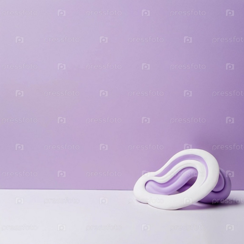 Уникальная изогнутая скульптура белого и лавандового цветов мирно стоит на гладкой поверхности, дополненная мягким фиолетово-белым фоном, который подчеркивает ее современный дизайн. Генеративный ИИ